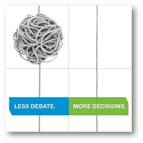 Für eine spielerische Vermittlung der Kernbotschaften sorgte ein magischer Würfel, der in die unterschiedlichsten Richtungen geklappt werden kann, so dass immer wieder neue Würfeloberflächen entstehen. Zentrale gestalterische Elemente sind die Plakat-Motive der internen Kampagne. Zusätzlich werden die Mitarbeiter auf das Intranet-Angebot zum Complexity Reduction Program aufmerksam gemacht.