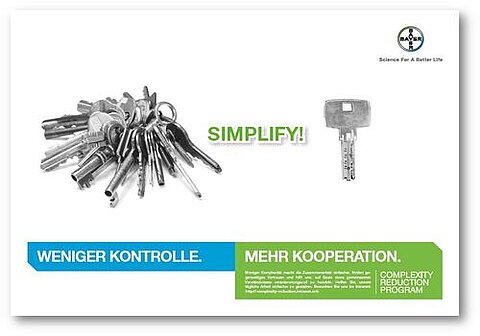 Die Mittel und Maßnahmen rund um das Complexity Reduction Program sollen ein Bewusstsein für die Notwendigkeit und Wichtigkeit von möglichst einfachen und effizienten Arbeitsaufläufen und -prozessen schaffen. Die Kernbotschaft: Produktivitätserhöhung durch Komplexitätsabbau steigert den Erfolg der Arbeit aller. Die interne Kampagne setzt auf einen eigenständigen Look innerhalb des Corporate Designs und setzt damit einen starken Akzent, um sich im internen Kommunikationswettbewerb bei Bayer zu behaupten.