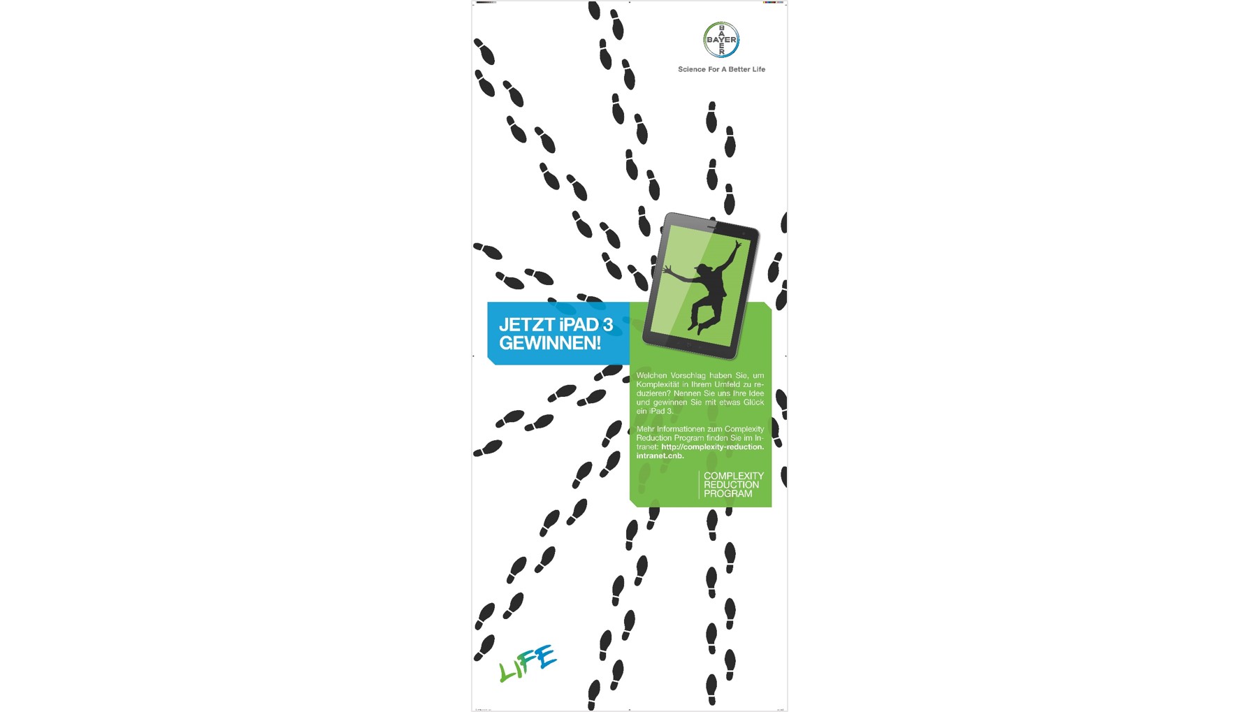 Die Mittel und Maßnahmen rund um das Complexity Reduction Program sollen ein Bewusstsein für die Notwendigkeit und Wichtigkeit von möglichst einfachen und effizienten Arbeitsaufläufen und -prozessen schaffen. Die Kernbotschaft: Produktivitätserhöhung durch Komplexitätsabbau steigert den Erfolg der Arbeit aller. Die interne Kampagne setzt auf einen eigenständigen Look innerhalb des Corporate Designs und setzt damit einen starken Akzent, um sich im internen Kommunikationswettbewerb bei Bayer zu behaupten.